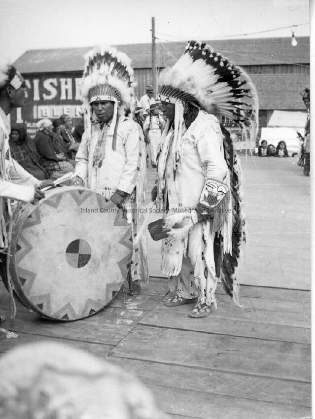 Coupeville Water Festival circa 1930's. Two Native American men in traditional clothing wearing large headresses. One man is holding a large drum and the other is holding an eagle feather fan.