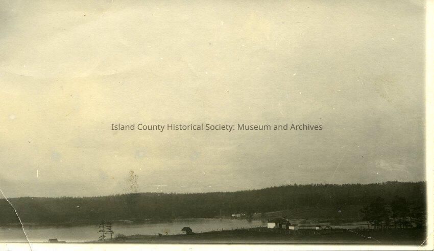 The first courthouse located in Coveland can barely be seen in the distance. This photo was taken from a hill in San de Fuca. The majority of the photo is sky. Penn Cove can be seen in the lower left. On the back: "San de Fuca School?"