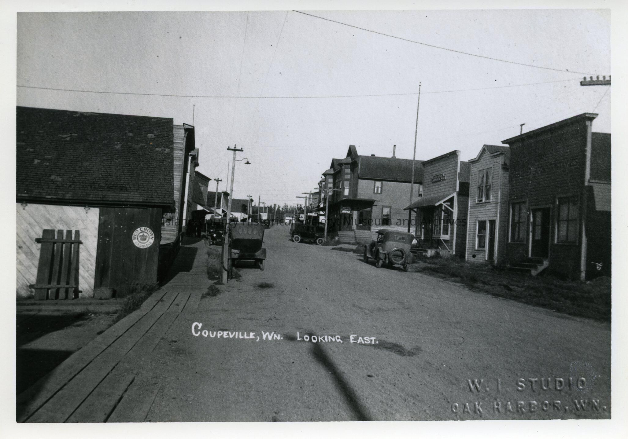 Black and white photograph looking east down Front Street, Coupeville. Produced by W. I. Studio, Oak Harbor, WA.