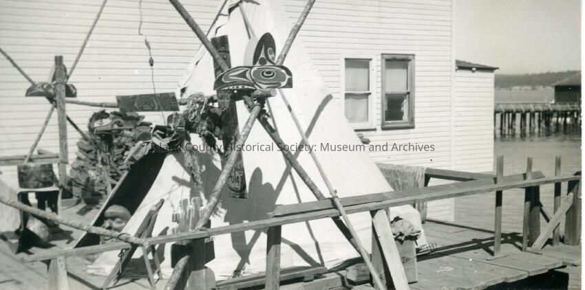 Photo water festival in Coupeville. Teepee on a deck over the water. The Coupeville wharf is in the background. On the back: *Main Street Aug 9-10-11