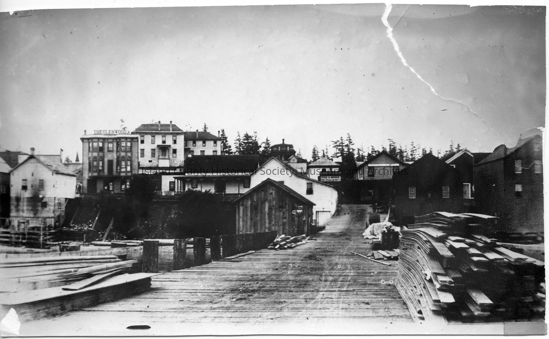 Black and white photo of Robertson's Wharf (Robertson's Dock) in Coupeville. Stacks of planks are on the wharf. Note on back: "Still there. It burned in 1896."