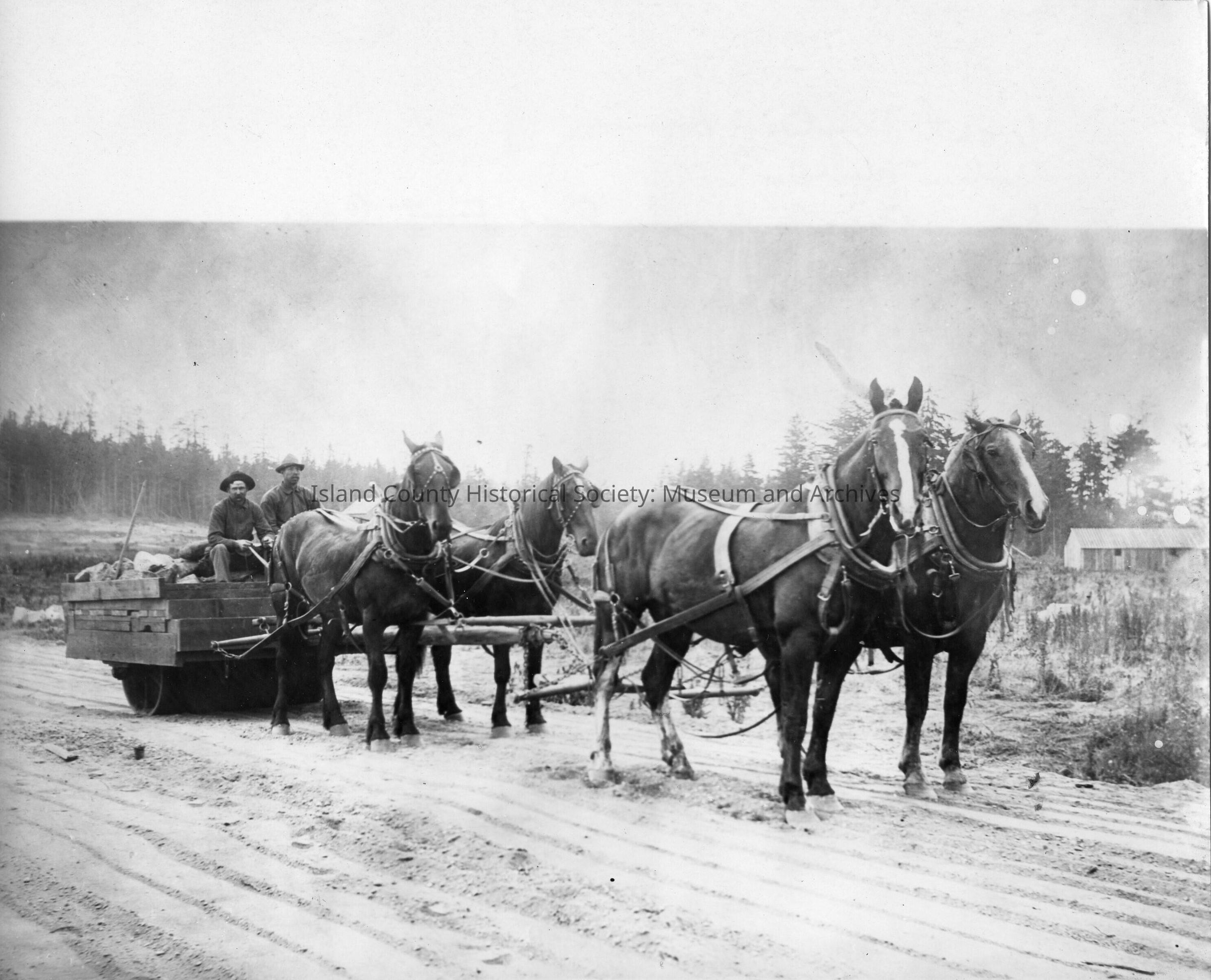 Two men on a wagon over a roller, maybe a road maker, pulled by four horses. Wagon has bags, stones, or logs.