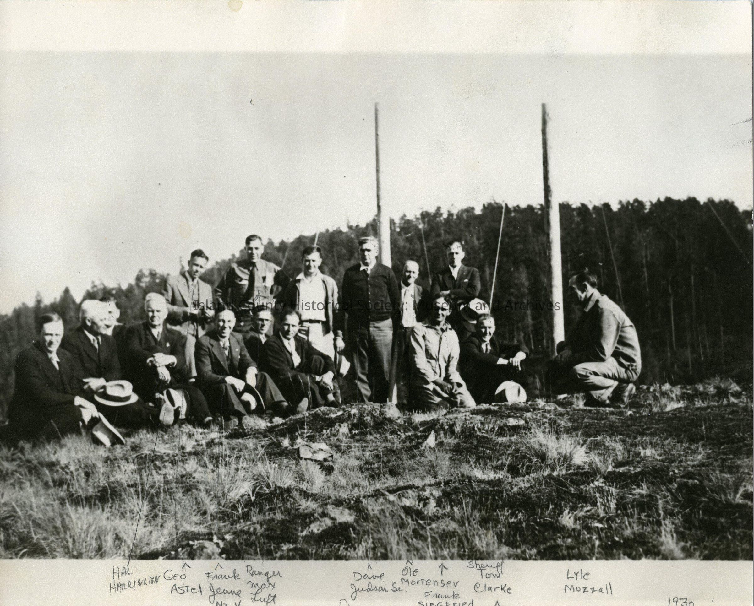 This black and white photo negative shows the Deception pass bridge committee sitting and standing for a group photo. From left to right Geo Astel, Frark Jenne, Ranqu May Luft, Dave Judson, Ole Mortensen, Frauk Siegfried, Tom Clarke, Lyle Muzzall, (Others are not named).Made/Created