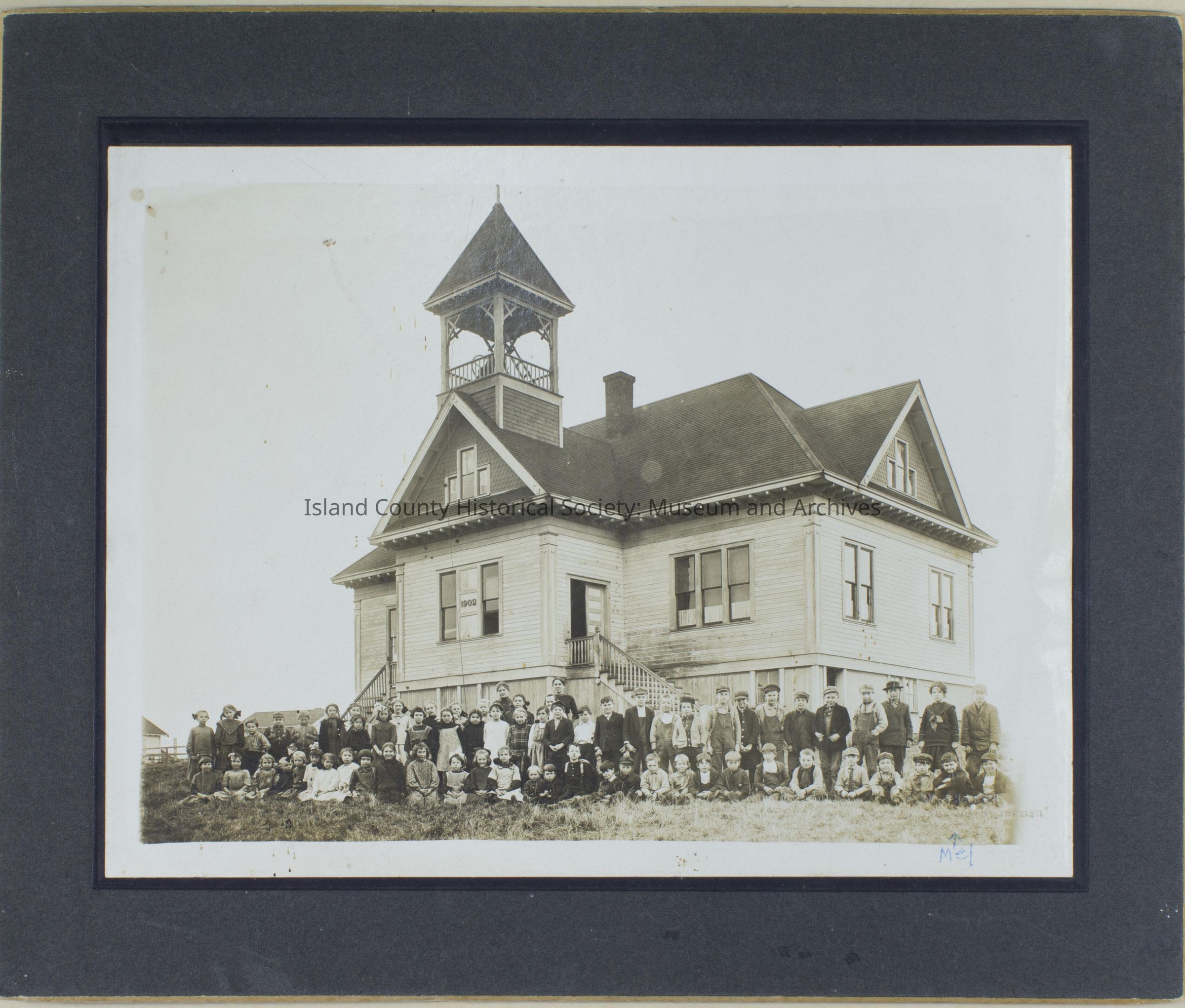 Black and white albumen photo of a group of school children and teachers in front of a school. Bell tower, Chimney. In ink at lower right: "Mel". On the back: "Old O H School Mel started here"