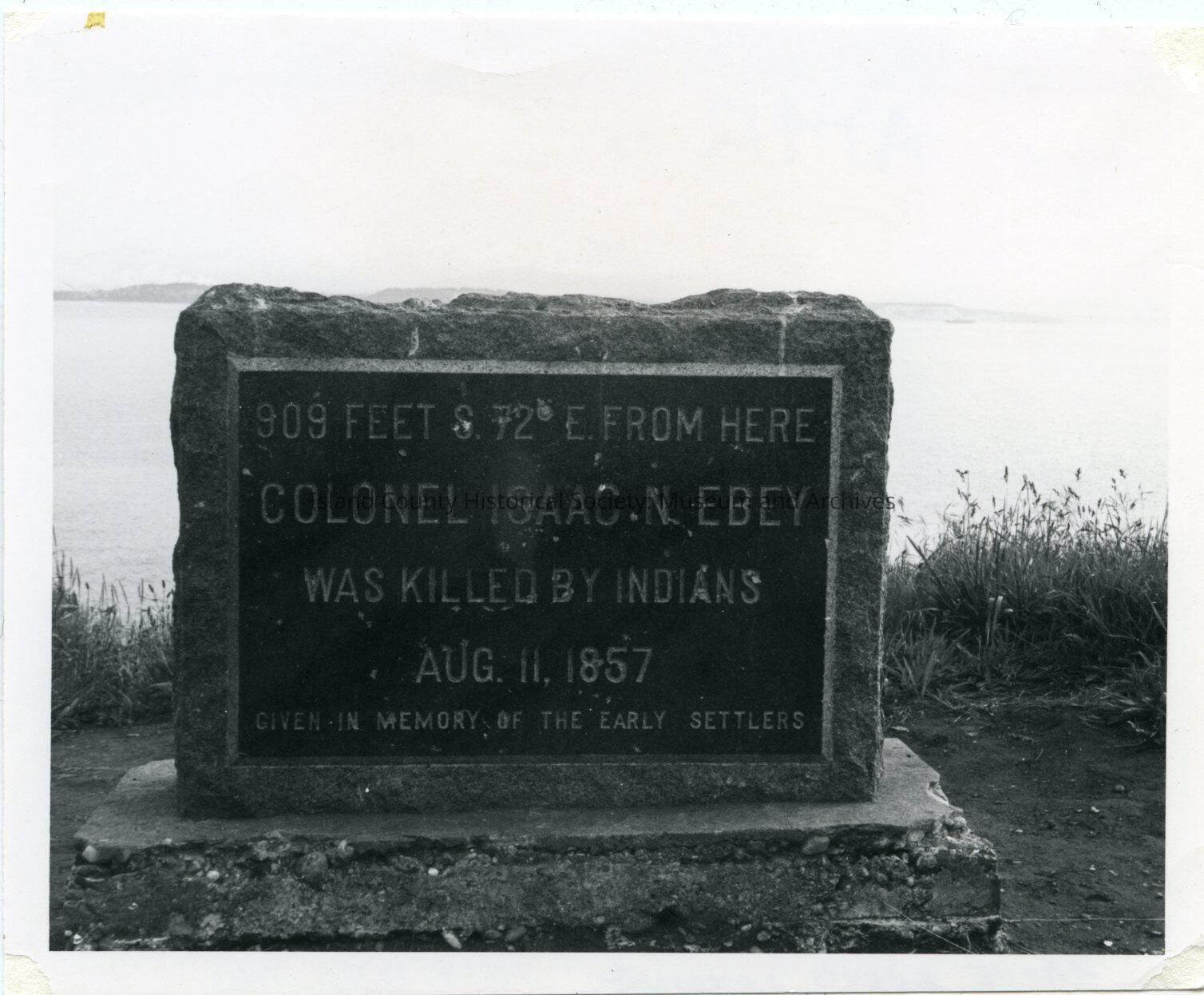 "Above Ebey's Landing" Sign: "909 feet S 72 degrees E. from here Colonel Isaac N. Ebey was killed by Indigenous Peoples. Aug. 11, 1857. Given in memory of the early settlers."