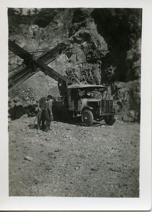 The black and white photo shows a behind the scenes look at the Deception Pass bridge construction. On the left side of the photograph there is a steam crane(not pictured) that is loading dirt onto the back of a truck. Next to the truck are two men examining the ground.
