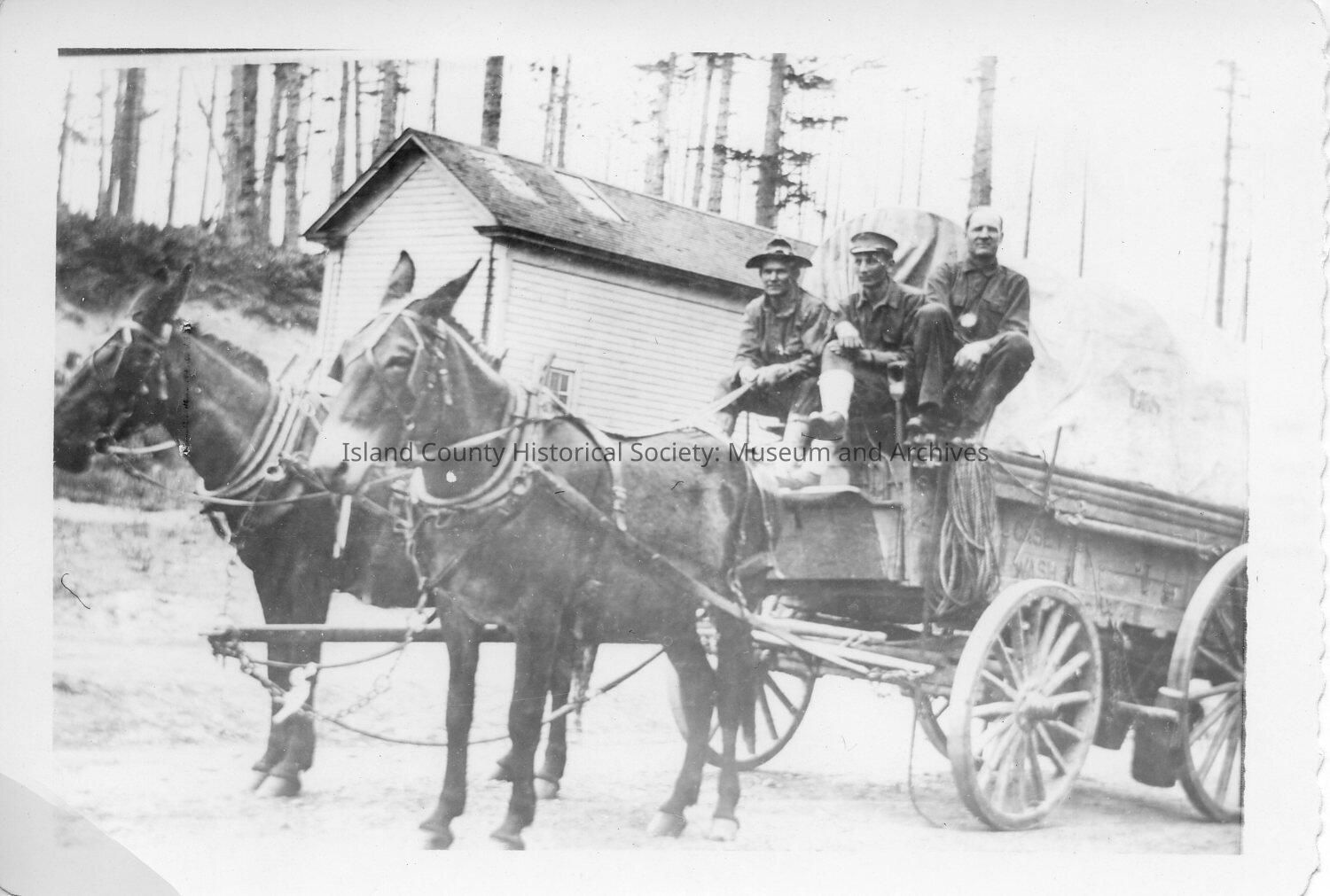 Three soldiers on cart pulled by two mules. (negative included)