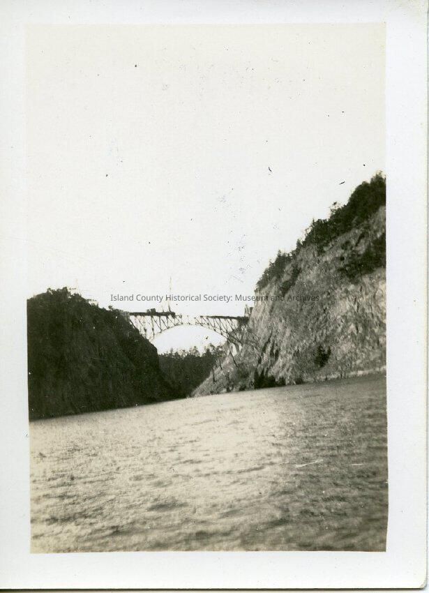 The photo is black and white and shows the development of Deception Pass bridge. The span that is being built is likely Canoe Pass. On either side of the newly developed bridge are landforms that have bundles of trees. Halfway through the constructed bridge shows a large crane.