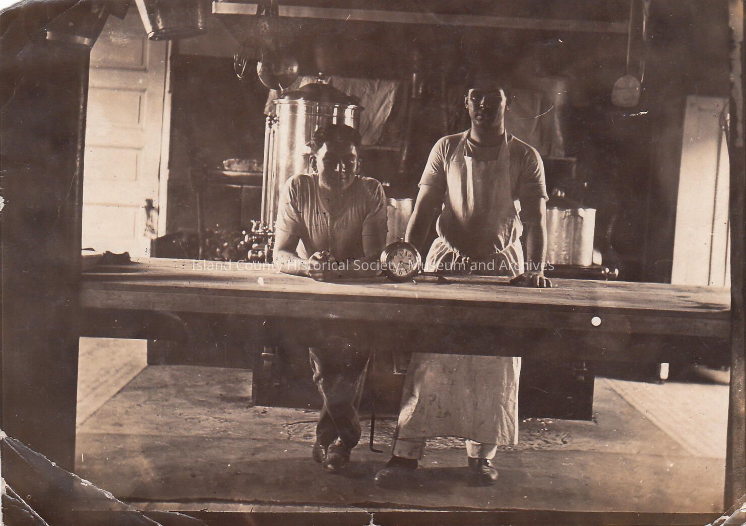 Barracks Kitchen Crew, Ft Casey. Notice coffee pot and coals stove. SJK