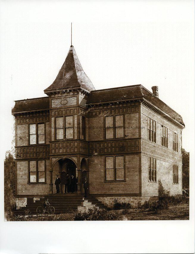 This photograph depicts the original courthouse from 1891. The courthouse was in existance until 1949, when a new one was built.