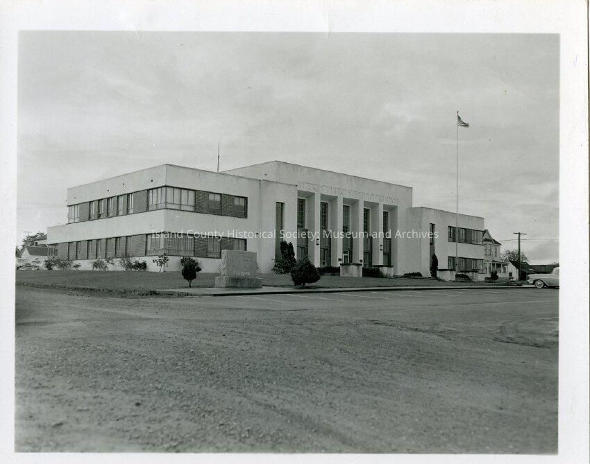 This photograph depicts the coupeville courthouse built in 1949. The photo is a view of the entire facade and side of the building, also includes most of the parking lot. Black and White.