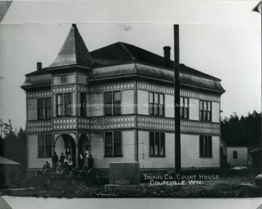 This photograph depicts the original Coupeville courthouse, built in1891 by Howard Lovejoy. This photo shows a group of people standing at the top of the stairs.