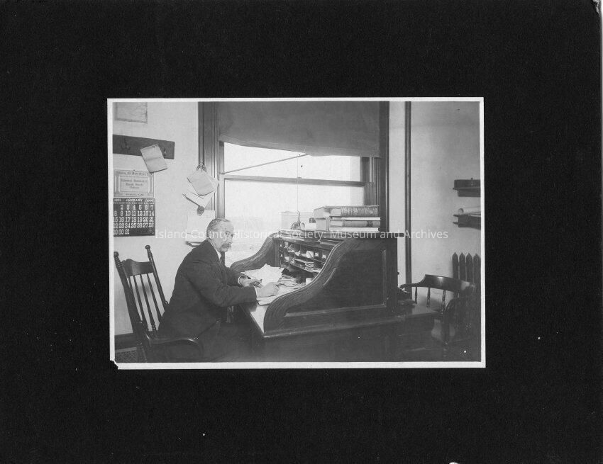 Photo shows a man sitting at a desk at the Island County Court House in Coupeville. Man is unidentified. Back of photo reads: Complements of County Surveyor's Office 1905.