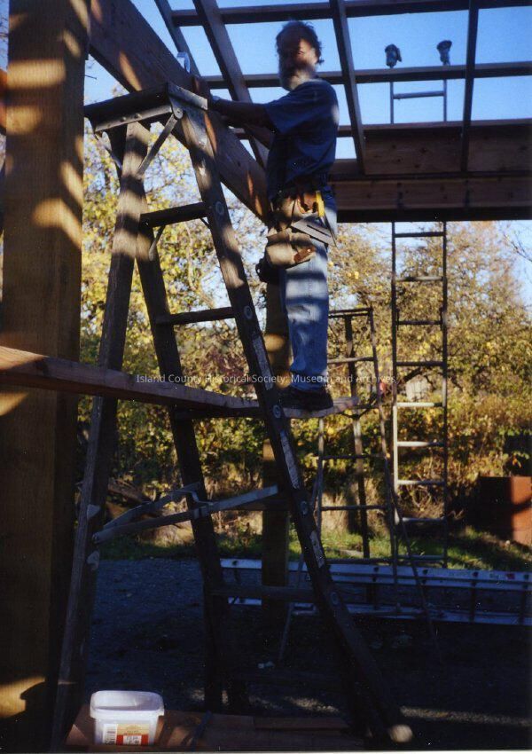 Restoration of Capt Thomas Coupe's house. A man standing on a ladder inside the framework of the house. Back of photo reads: Jim Short Fall 07' working on Coupe barn