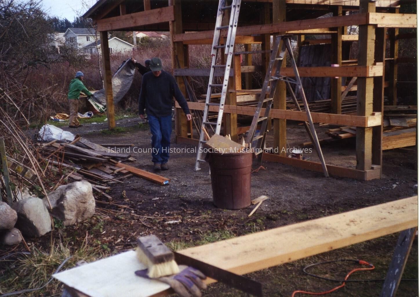 Restoration of Capt Thomas Coupe's house. Three workers can be seen outside the framework of the house/barn. Two people in the background folding a tarp, one man in the foreground walking towards a rubbish can.