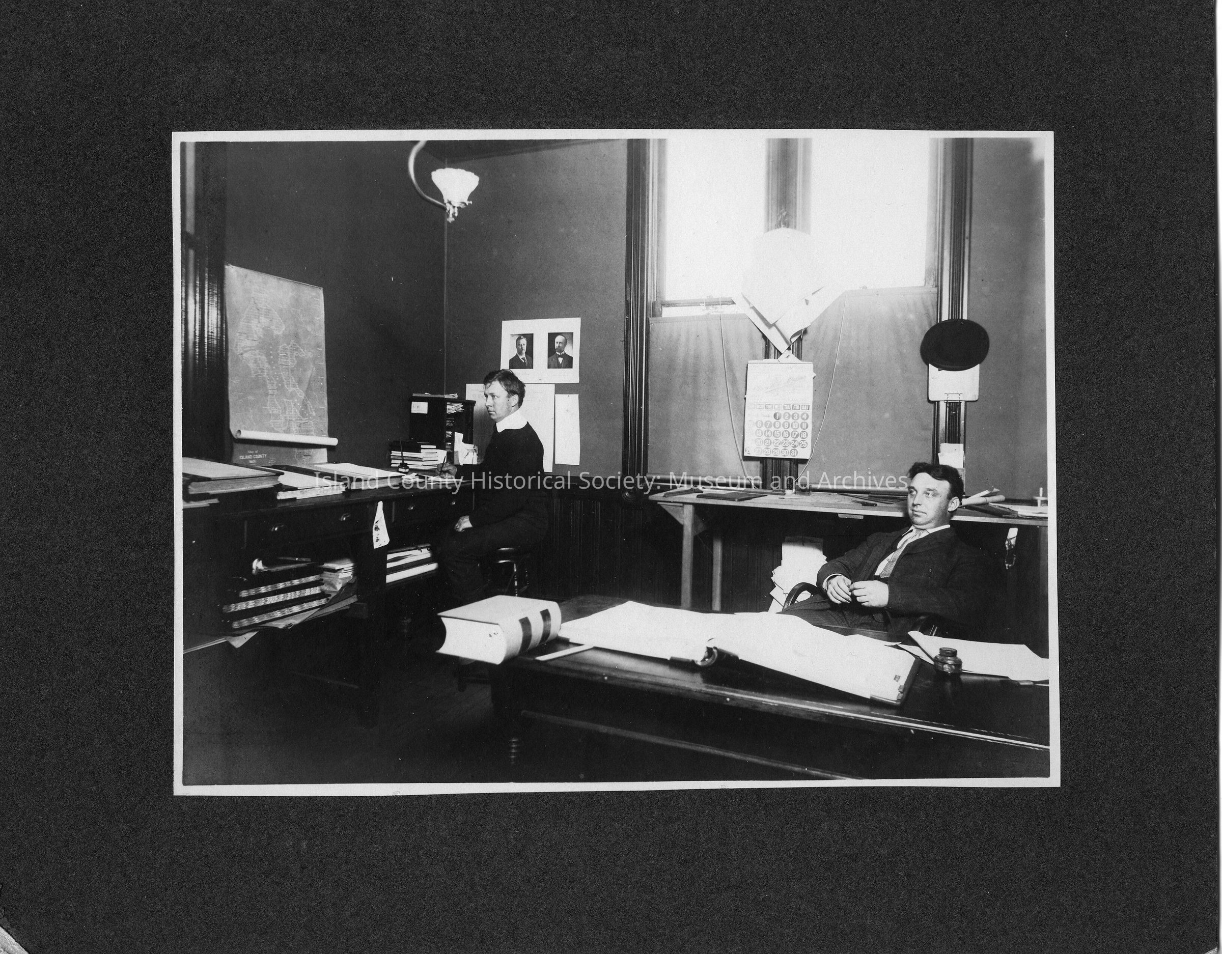 Island County Government Records Markus Wangsness and Luther Weedin seen in what is most likely the Assessor's Office of the 1891 Howard Lovejoy courthouse. Both men are at their desks with large record books and maps around them.