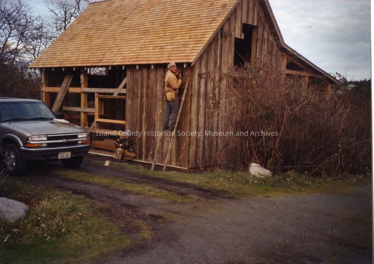 Restoration of Capt Thomas Coupe's house. Two construction workers working on the Coupe house/barn. In the photo most of the siding is up as well as the roof. One man is working on a ladder, below another worker is crouched beside the structure.