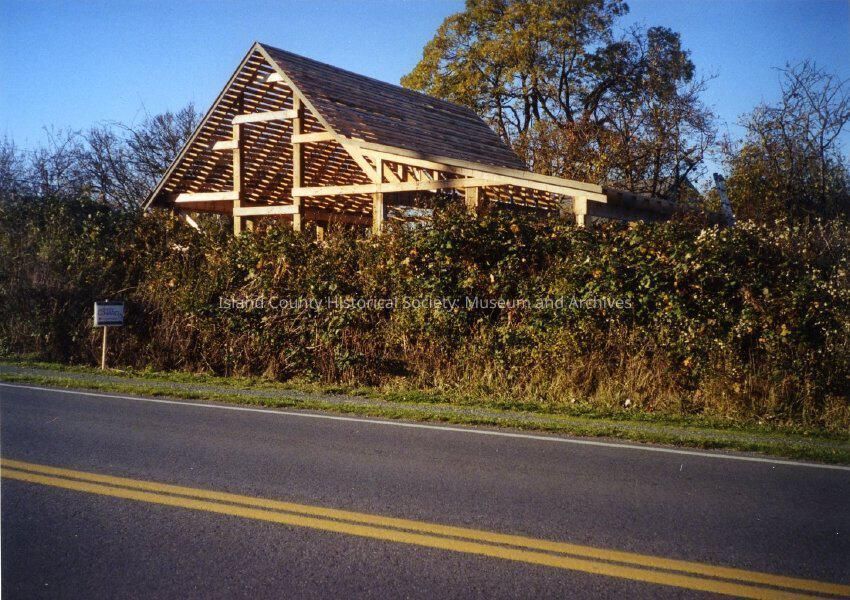 Restoration of Capt Thomas Coupe's house. Some framework and the roof are visible through the foliage, structure is seen in full sunlight. Photo is taken from across the street.
