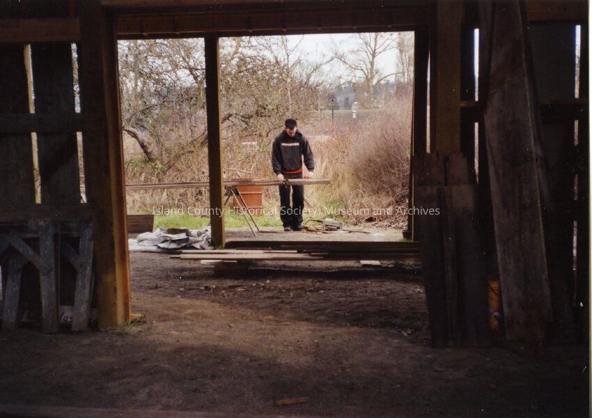 Restoration of Capt Thomas Coupe's house. View from inside the structure looking out. Outside the structure a man is working with a stack of lumber.