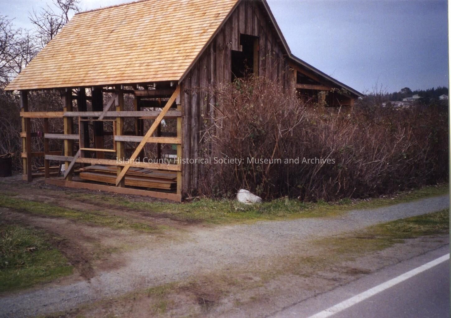 Restoration of Capt Thomas Coupe's house. Photo shows structure with roof finished, and one side of siding built up. Brush surrounds the structure.