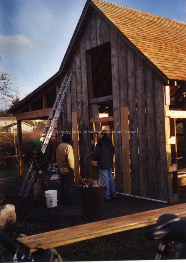 Restoration of Capt Thomas Coupe's house. Structure showing the siding being repaired, and the roof finished. Three workers stand in front of the building. A bicycle can be seen in the foreground.