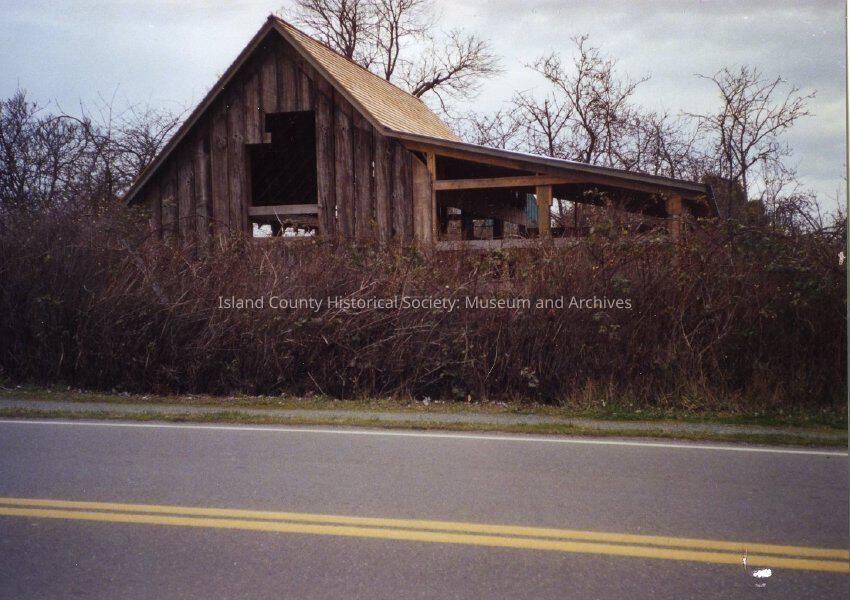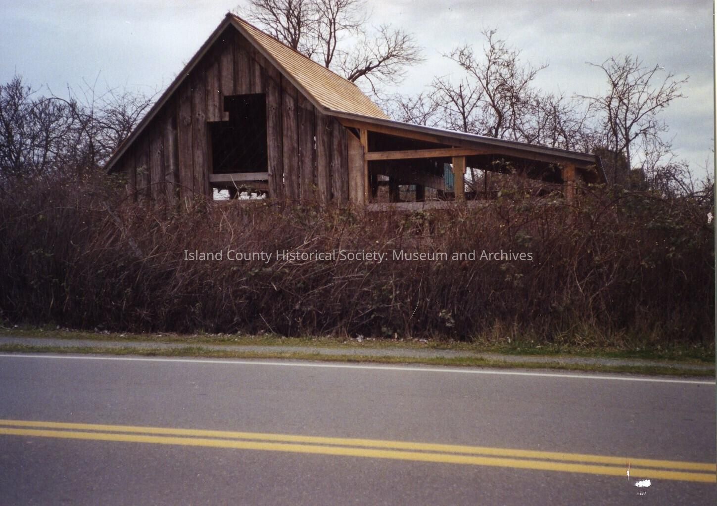 Structure shown with siding and roof finished, the building is surrounded by overgrown shubbery. Photo is taken from across the street.Collection