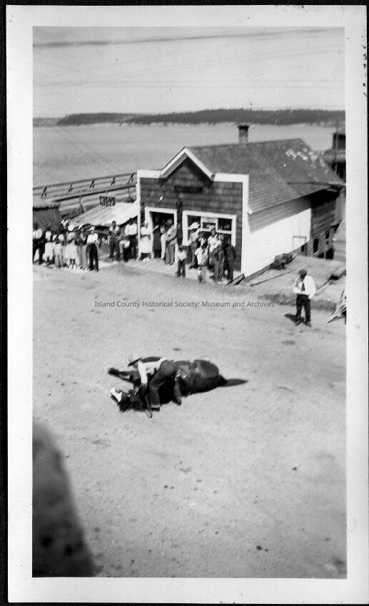Water Festival Black and White photo of Water Festival in Coupeville showing a cowboy leaning over a horse that is lying on the ground, spectators are standing by.
