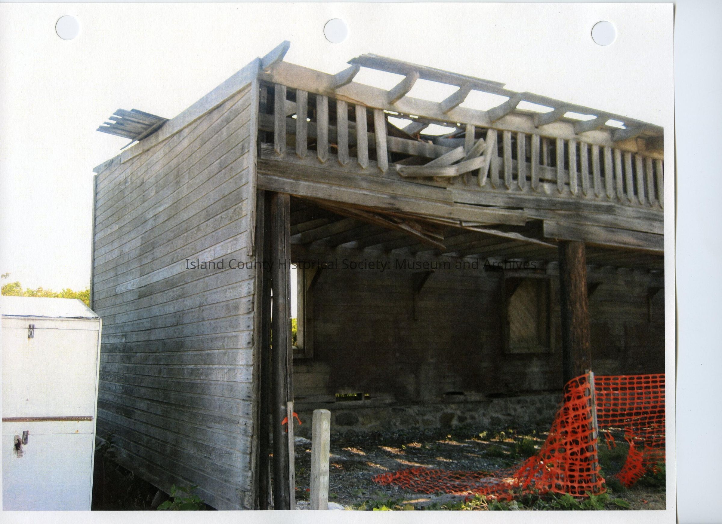 Ft. Casey fuel/mule shed Photo shows the corner of the mule shed where the roof has collapsed. The end of the shed is also visable.