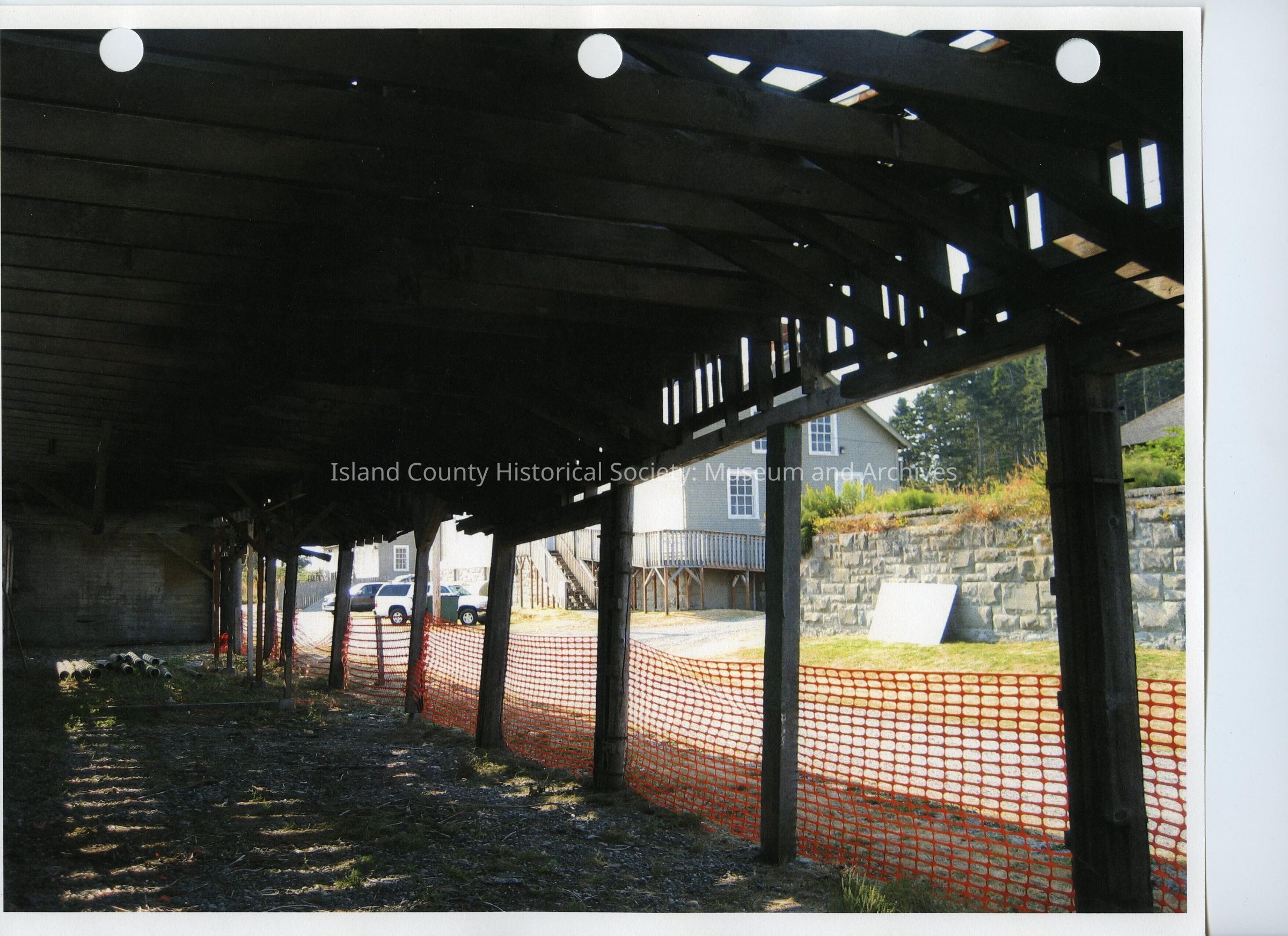 Ft. Casey fuel/mule shed interior of mule shed, orange construction fence in front. A large grey house can be seen across from the shed.