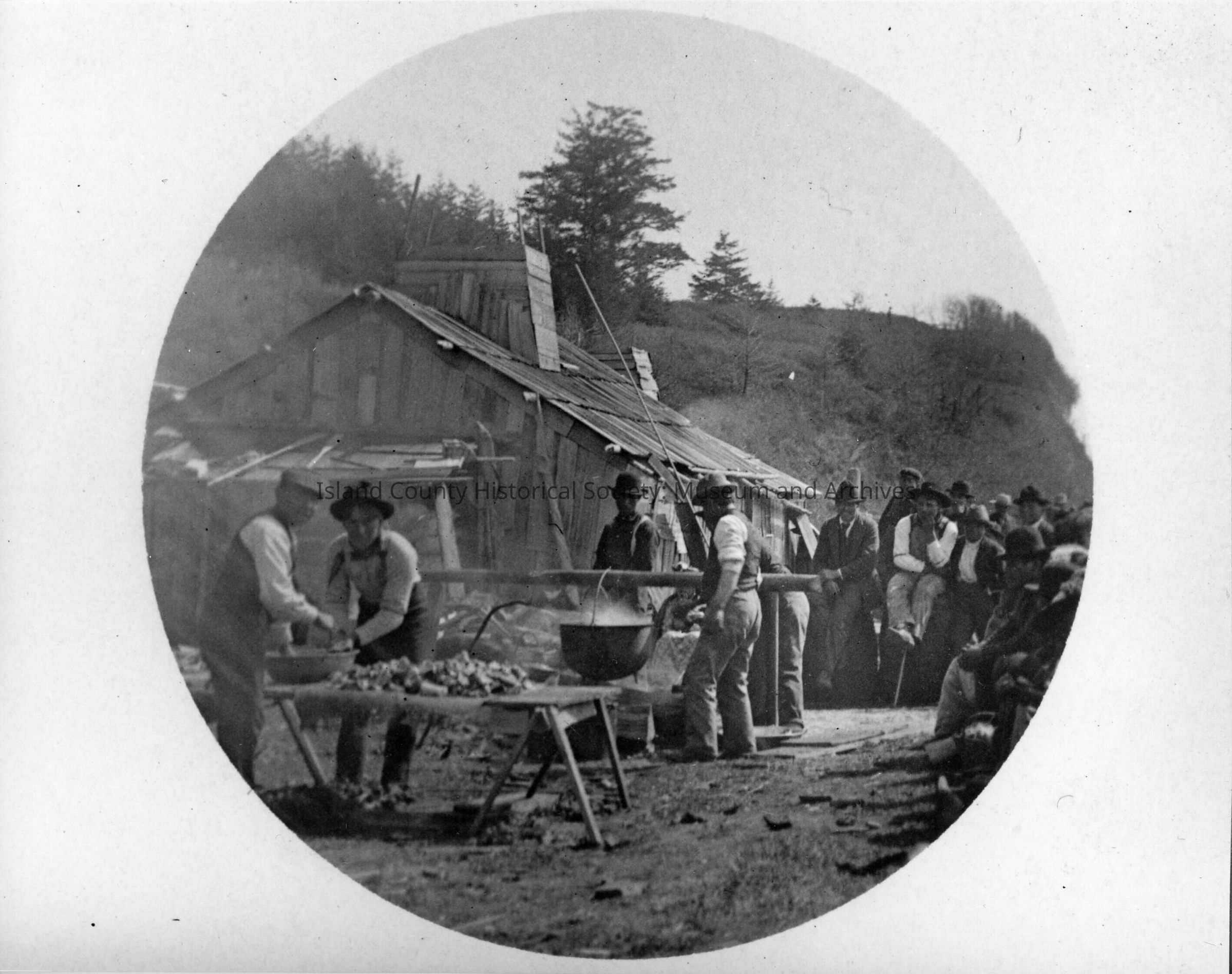 Indigenous Peoples of the Northwest Coast Black and white photo showing men cooking outdoors in Coupeville. See back of photo for ownership and use.