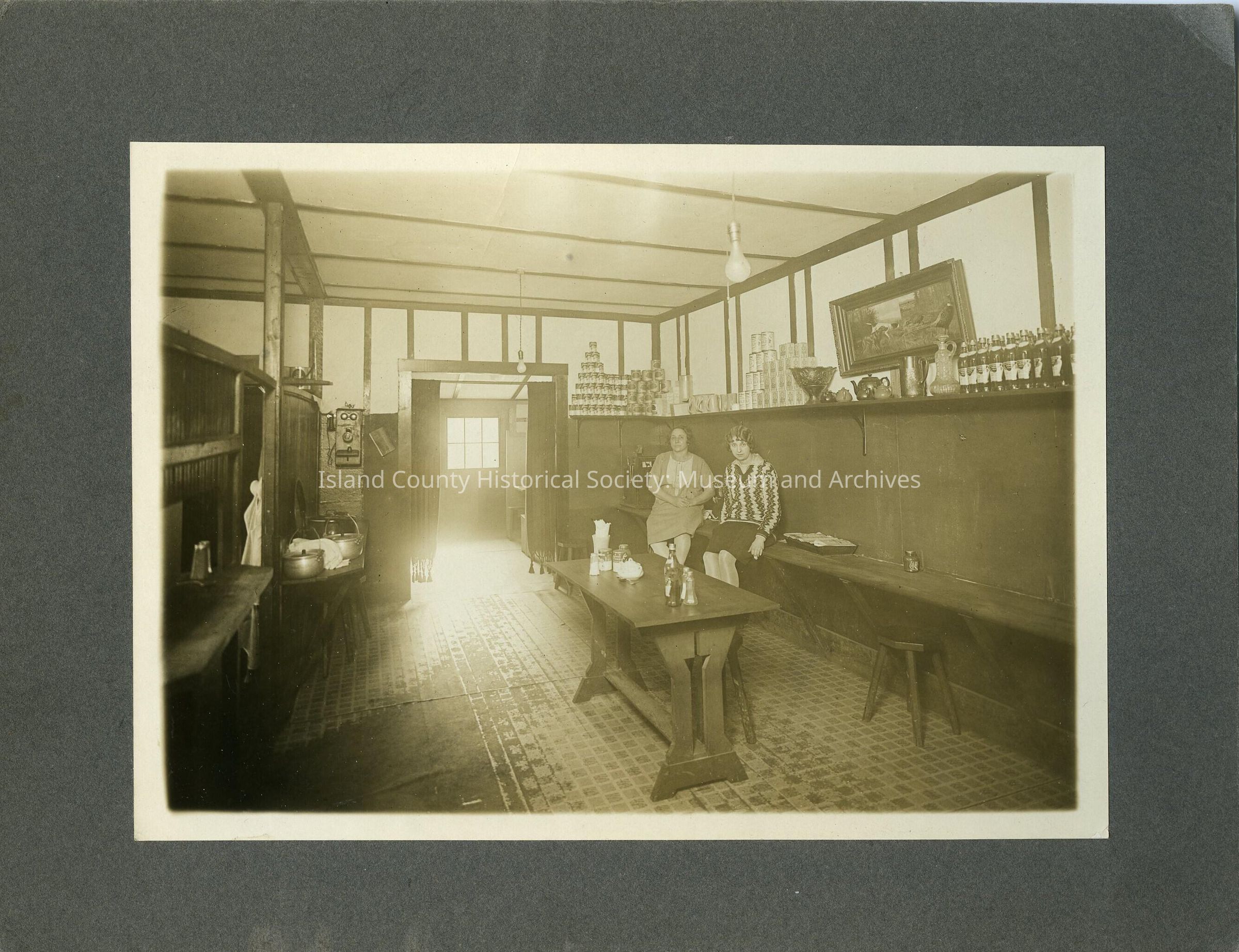 Pat's place established in 1926, owned by Robert and Pat Partridge. Pat's place was a hotel, barbershop and restaurant. Interior view of what is probably Pat's Place, in the corner two women are seated, Mrs Pat and Jessie Libbey Budsner.Made/Created