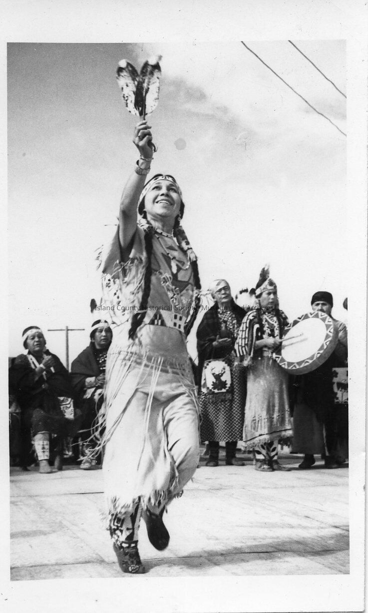 Coupeville Water Festival circa 1930 s. Harriette Shelton, daughter of Chief William Shelton, wearing Yakama regalia at the Water Festival. She is dancing while holding a feather, with drummers in the background.Collection