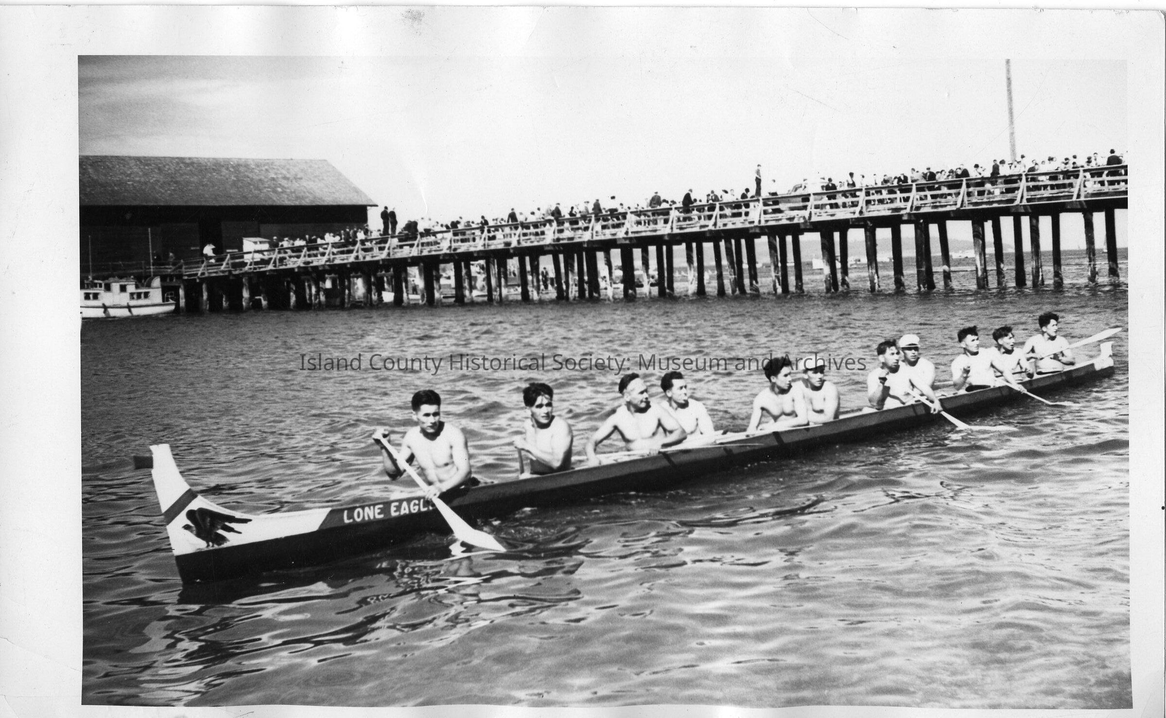 Coupeville Water Festival unknown year (at first listed as circa 1950's). A group of several Native Americans in a canoe by the Coupeville wharf. The Canoe is the Lone Eagle.