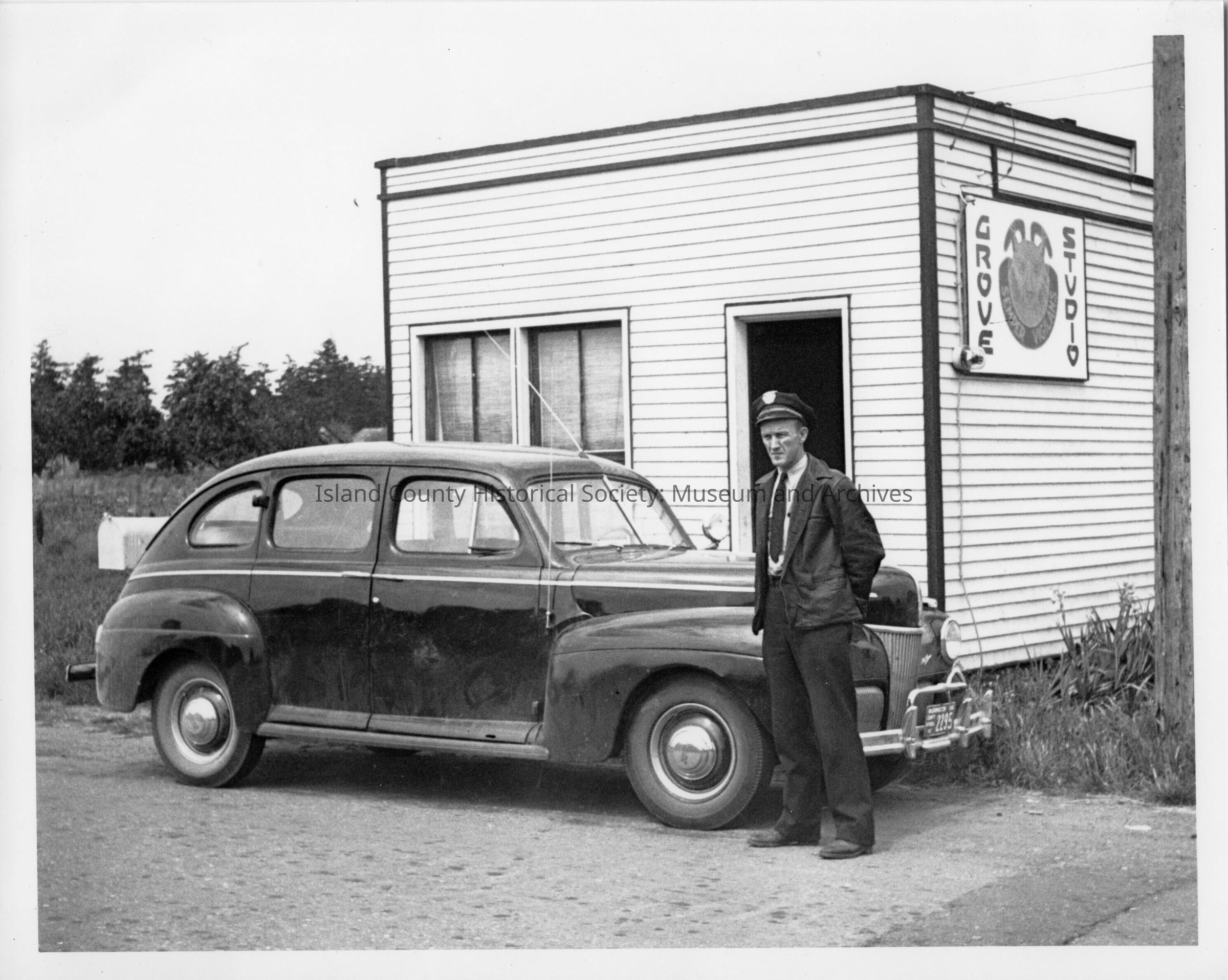 Sheriff Thomas W Clark standing outside Grove Studio Photo in Prarie Center next to his car.