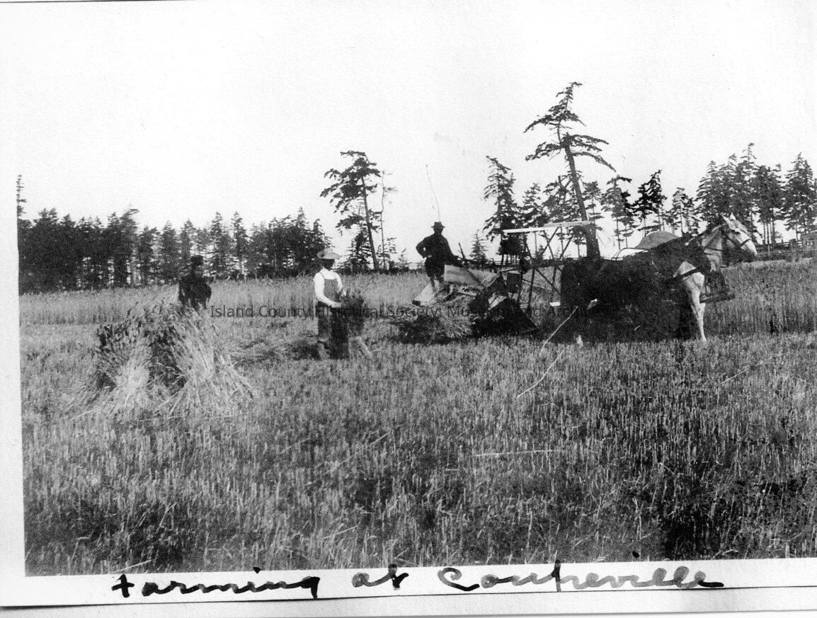 Farming in Coupeville with a horse drawn plow and several laborers.