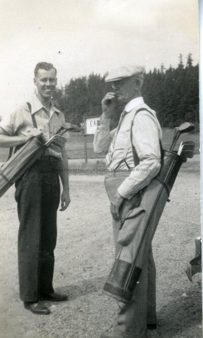 "At Similk beach for golf and supper-June 1940" Two unidentified men with golf bags.