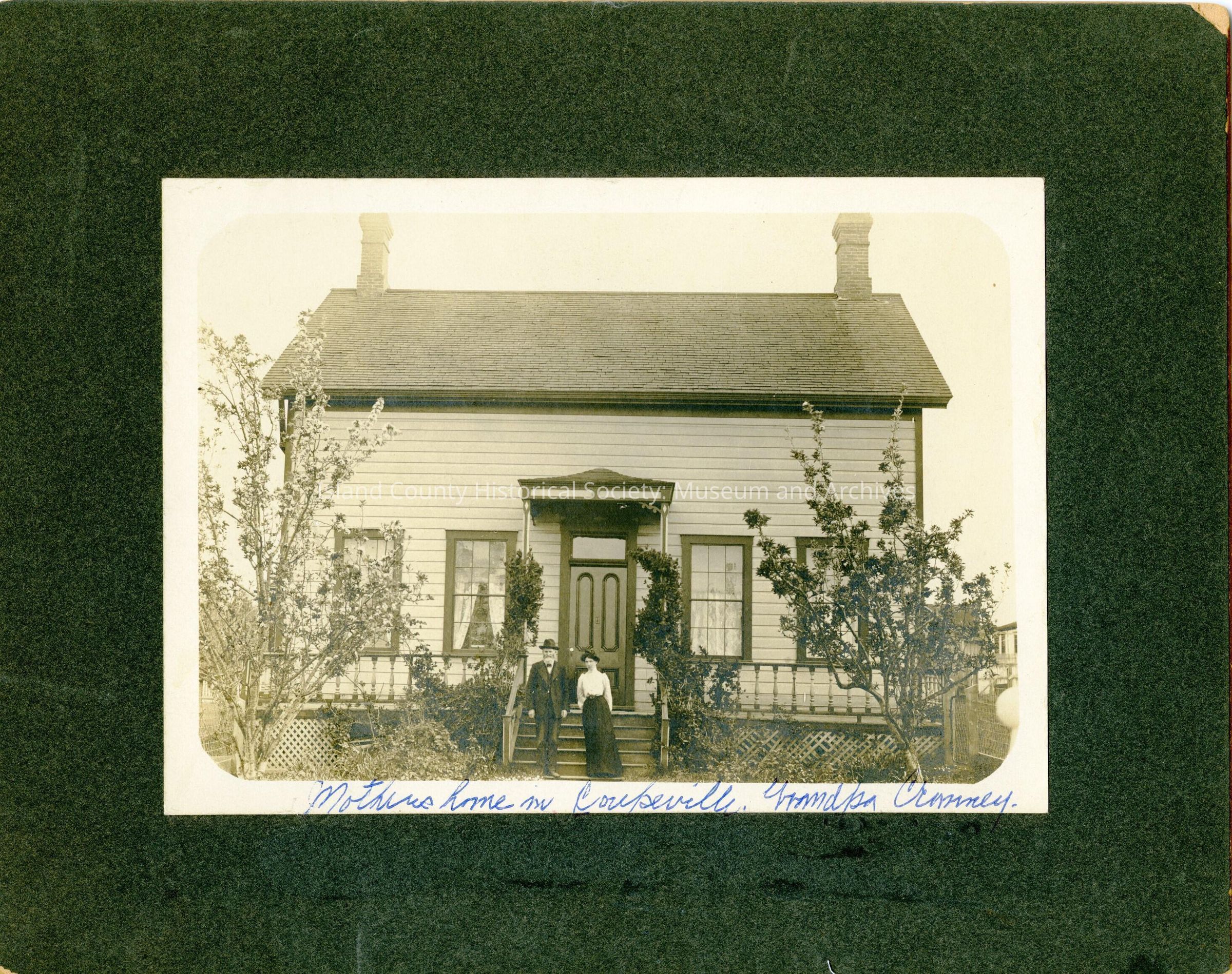 Thomas Cranney's Coupeville home. Thomas and Sarah Elizabeth Coupe Cranney in front of home.