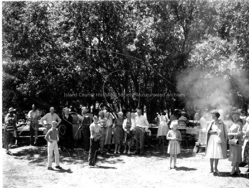 Coupeville picnic at Ft. Casey State Park, Sun July 22nd 1962. Men:3rd from left Shirley Parker, Spurgeon Calhoun, Herman Wanamaker