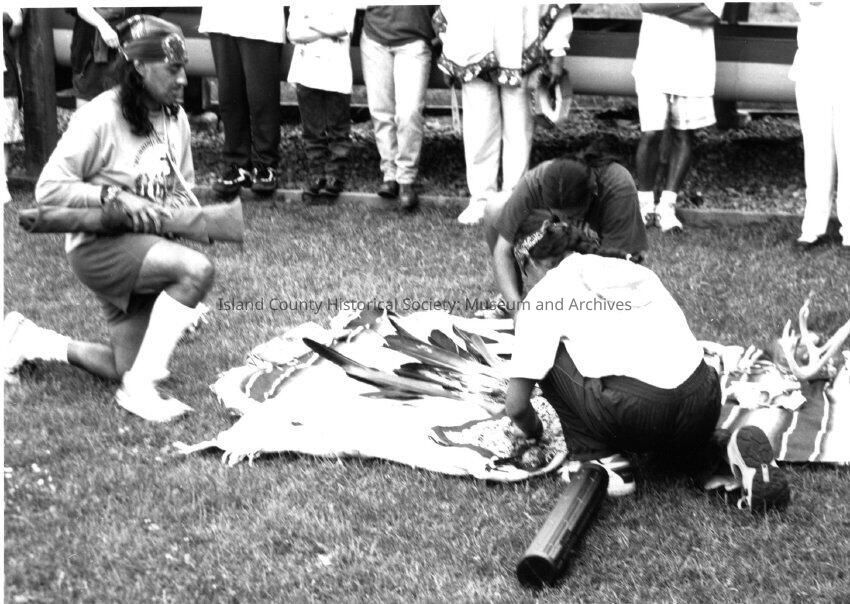 Three native americans kneeling over sacred items either packing up or unpacking. A blanket is layed out with eagle feathers and antlers. A man kneels in front of the blanket with a bundle on his knee. Several people are standing in the background.