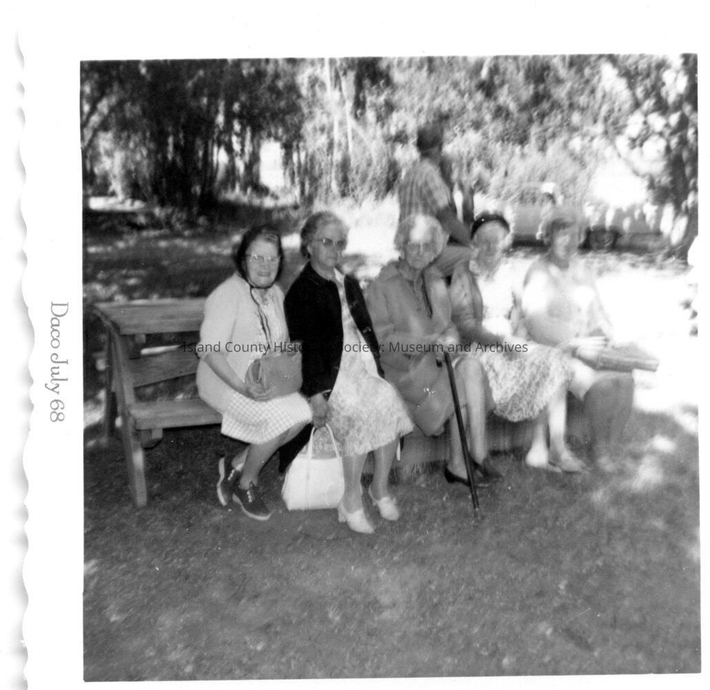 Group of people at Coupeville Old Timers Picnic in July 1968. The group is made up mostly of decendants of the pioneers to the island. Five ladies sitting on a park bench at the picnic.