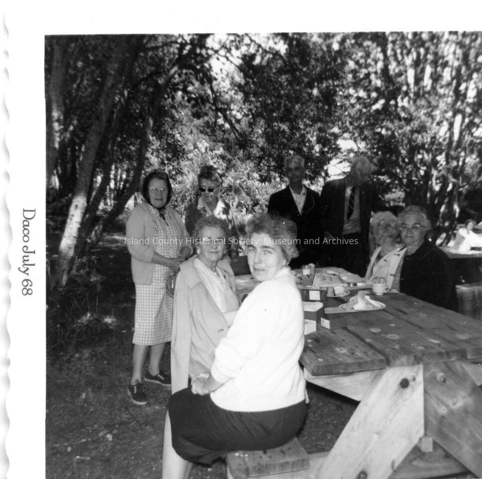 Group of people at Coupeville Old Timers Picnic in July 1968. The group is made up mostly of decendants of the pioneers to the island. Several men and women gathered around a picnic table posed for the photo. Front Center: Dorothy Sherman Background: Herman Wanamaker