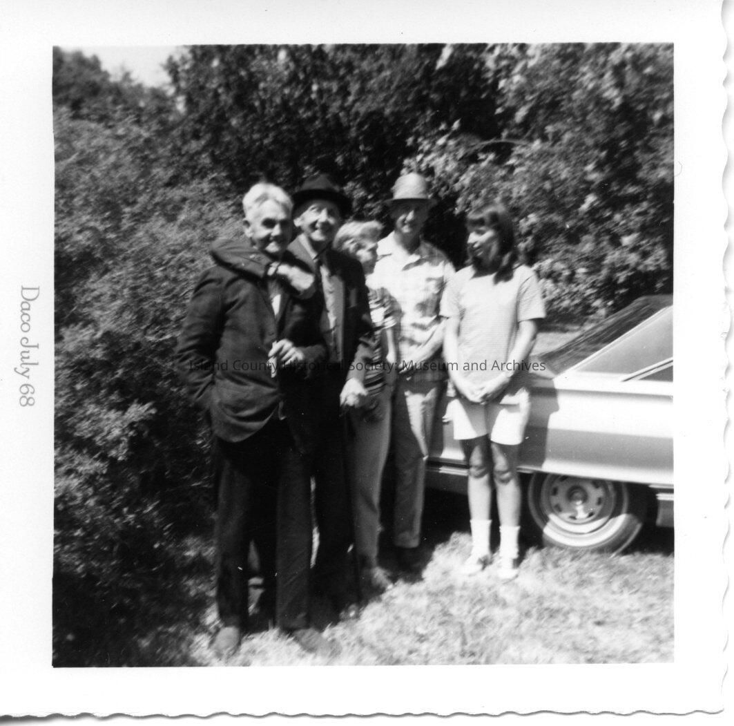 Group of people at Coupeville Old Timers Picnic in July 1968. The group is made up mostly of decendants of the pioneers to the island. Five friends standing on the grass near a car. On the back: