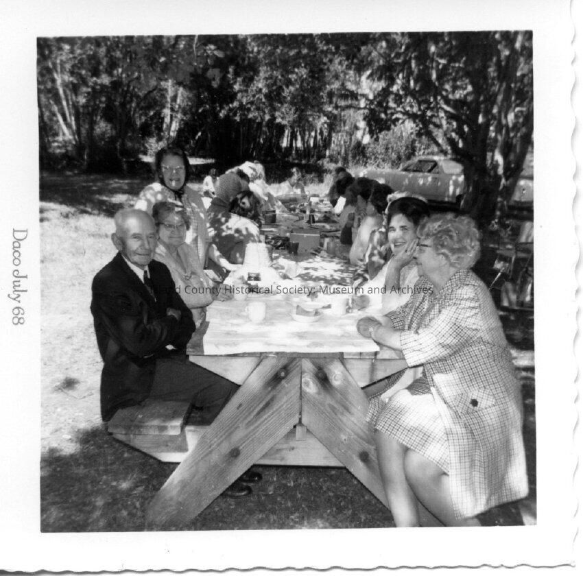 Group of people at Coupeville Old Timers Picnic in July 1968, gathered around a picnic table. The group is made up mostly of decendants of the pioneers to the island. Back of photo reads: John LeSourd and Ada LeSourd