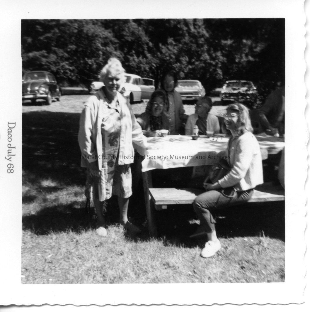 Group of people at Coupeville Old Timers Picnic in July 1968, gathered around a picnic table. The group is made up mostly of decendants of the pioneers to the island. Back of photo reads: