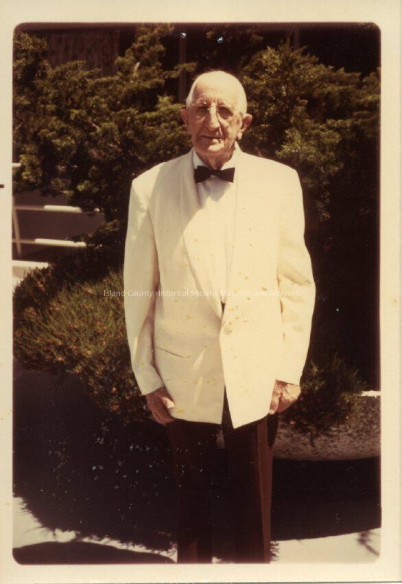 Dr George Heap wearing a white jacket and black bowtie, standing outside. On the back states Oak Harbor. From accession book: Group of pictures with old number 91-6-73A-P from 1891-1983.