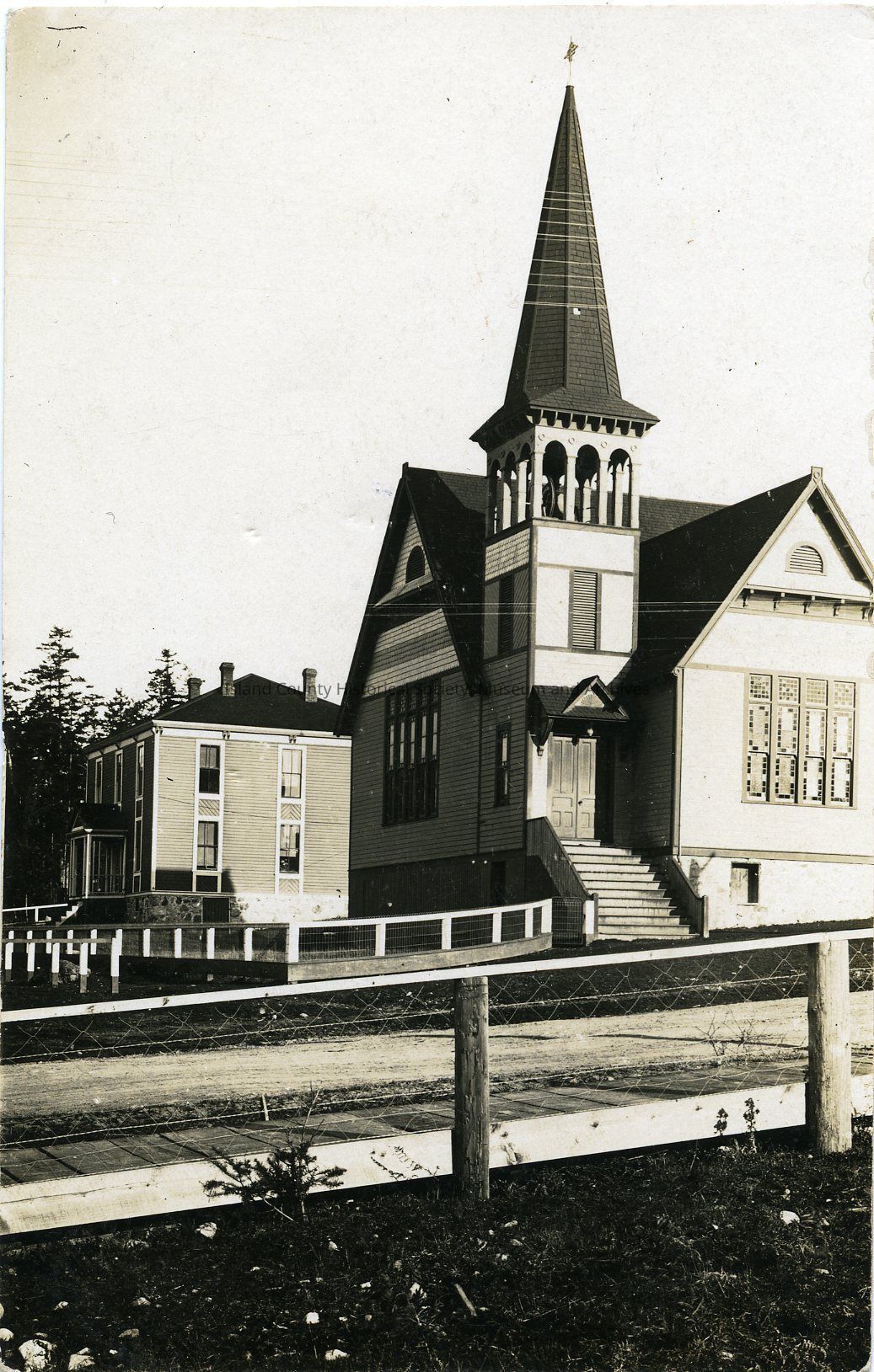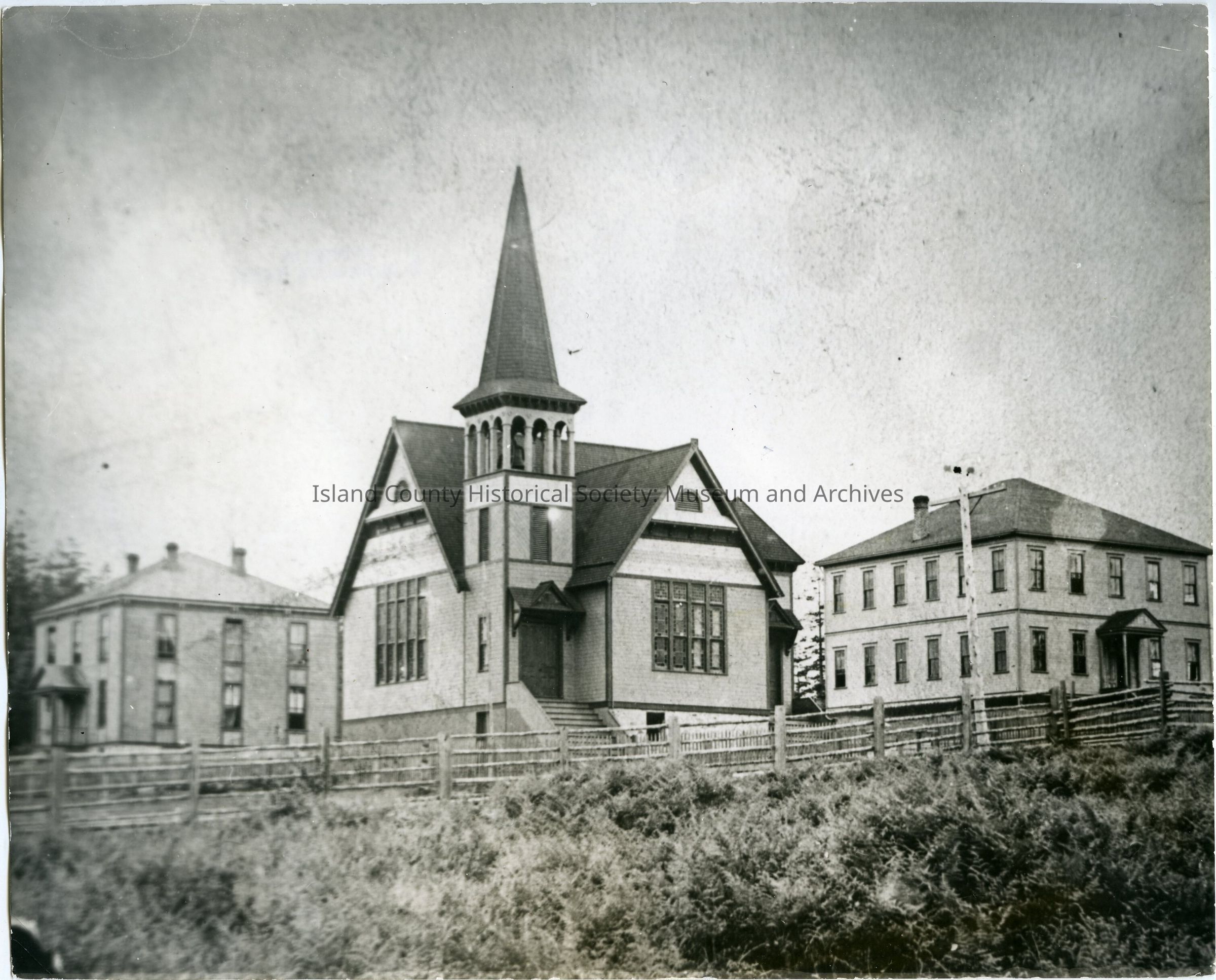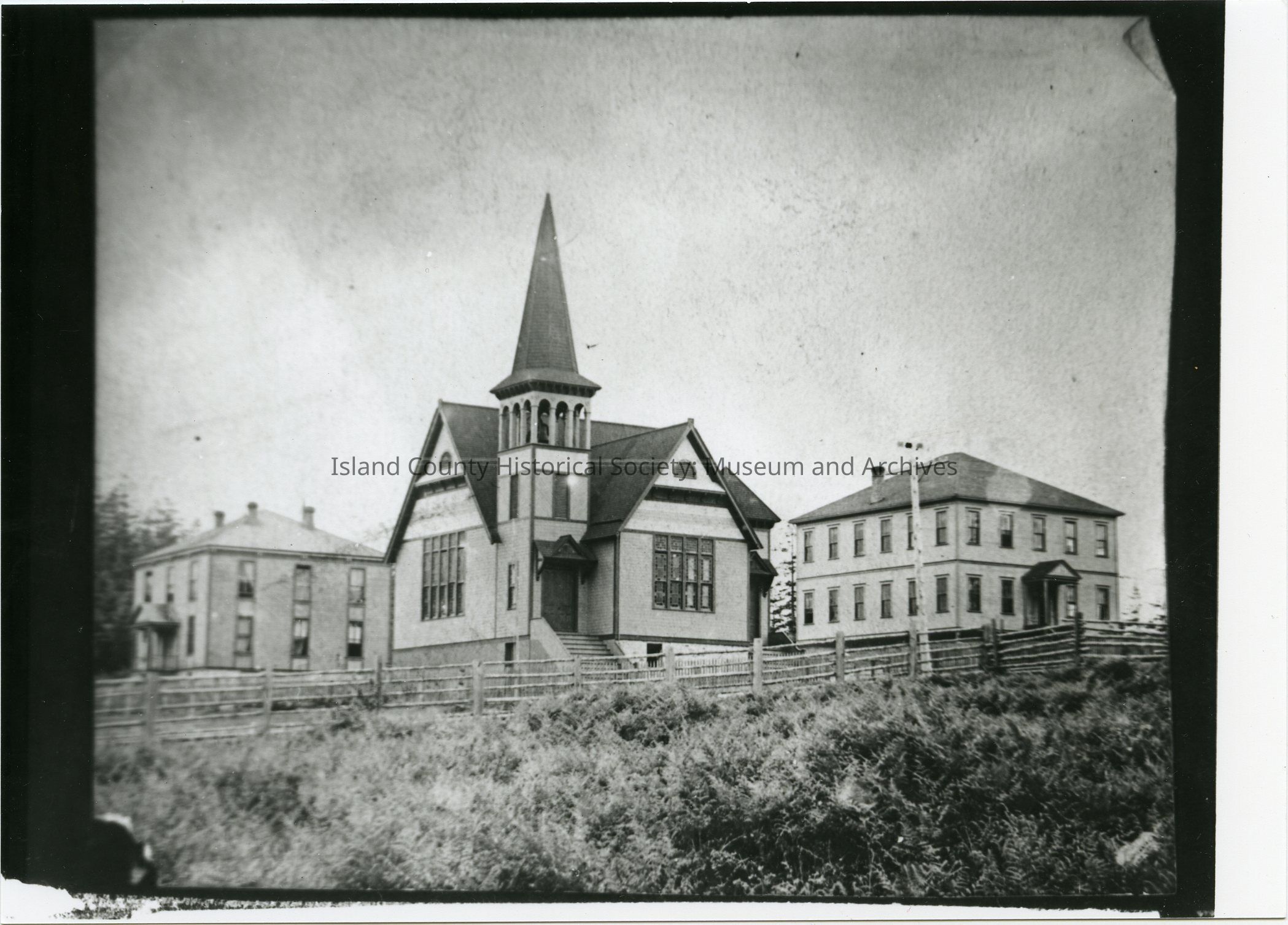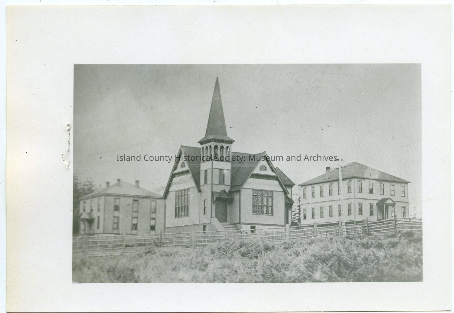 Photo of a church with a set of four narrow tall windows on the front, steeple on the left. Wood with stone foundation. Bell in the top of the steeple. Cedar shake roof. Small arched window at the peak of the roof in front. Trees around the edges of the property. Picket fence and a rail fence. Puget Sound Academy building. This and another building are now gone/were razed.