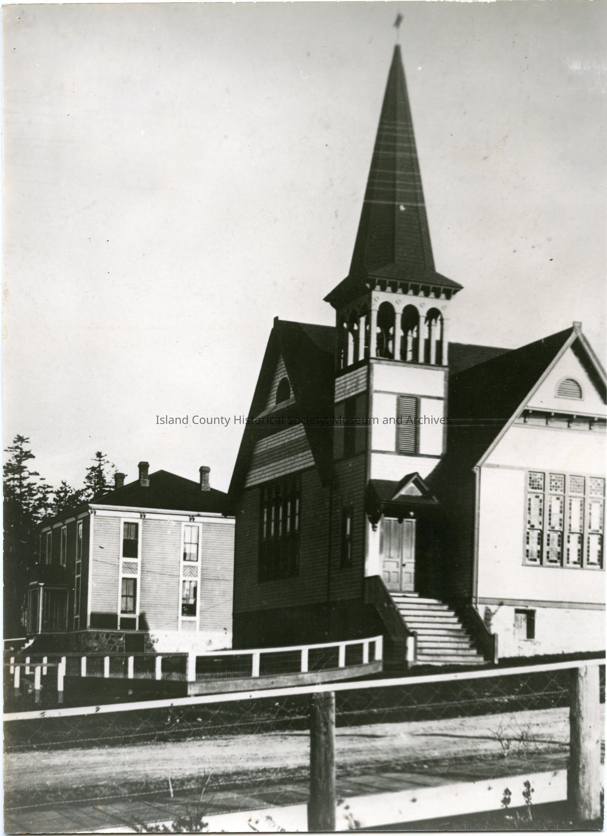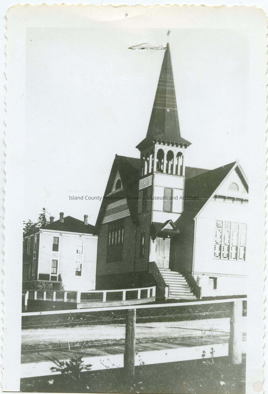 PNRO book page: 87: Congregational Church built in 1889. Bought by Catholic Church in 1934, now St. Mary's, first permanent Catholic Church on Whidbey Island. Restored to original appearance 1974-1976. Steeple and bell tower reconstructed and building painted to match the original.