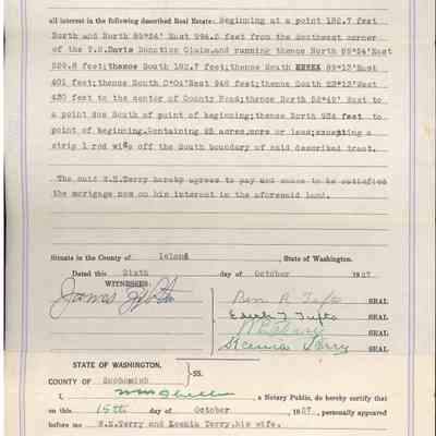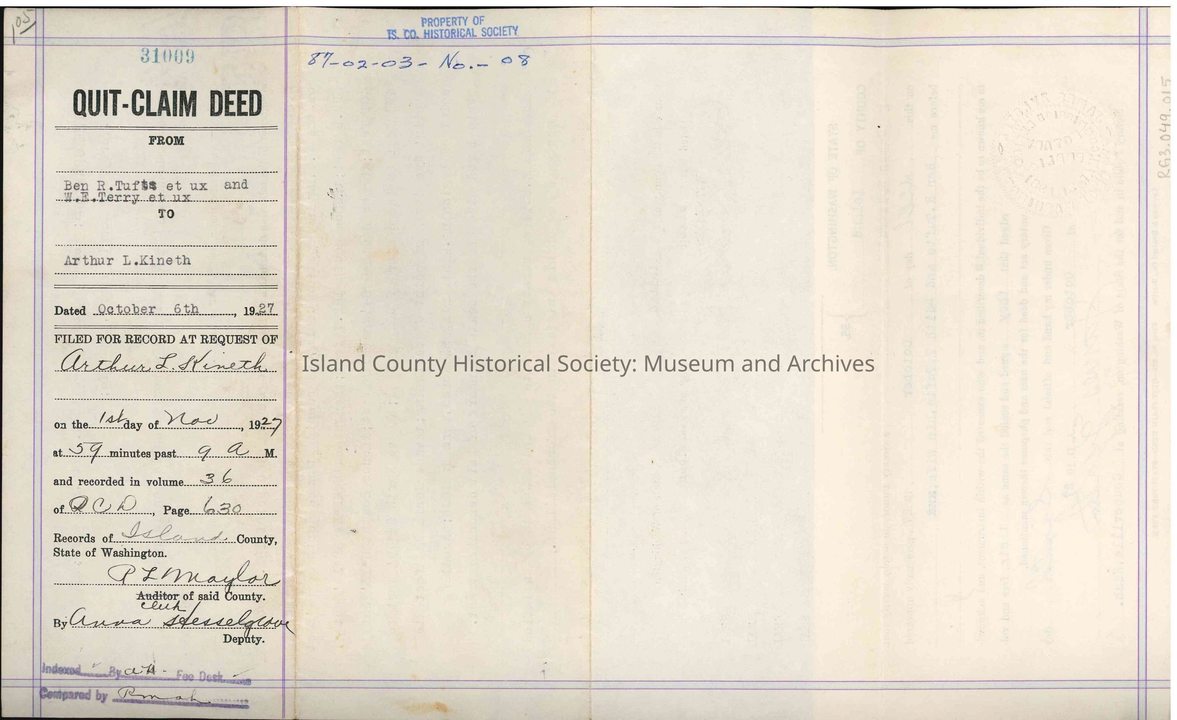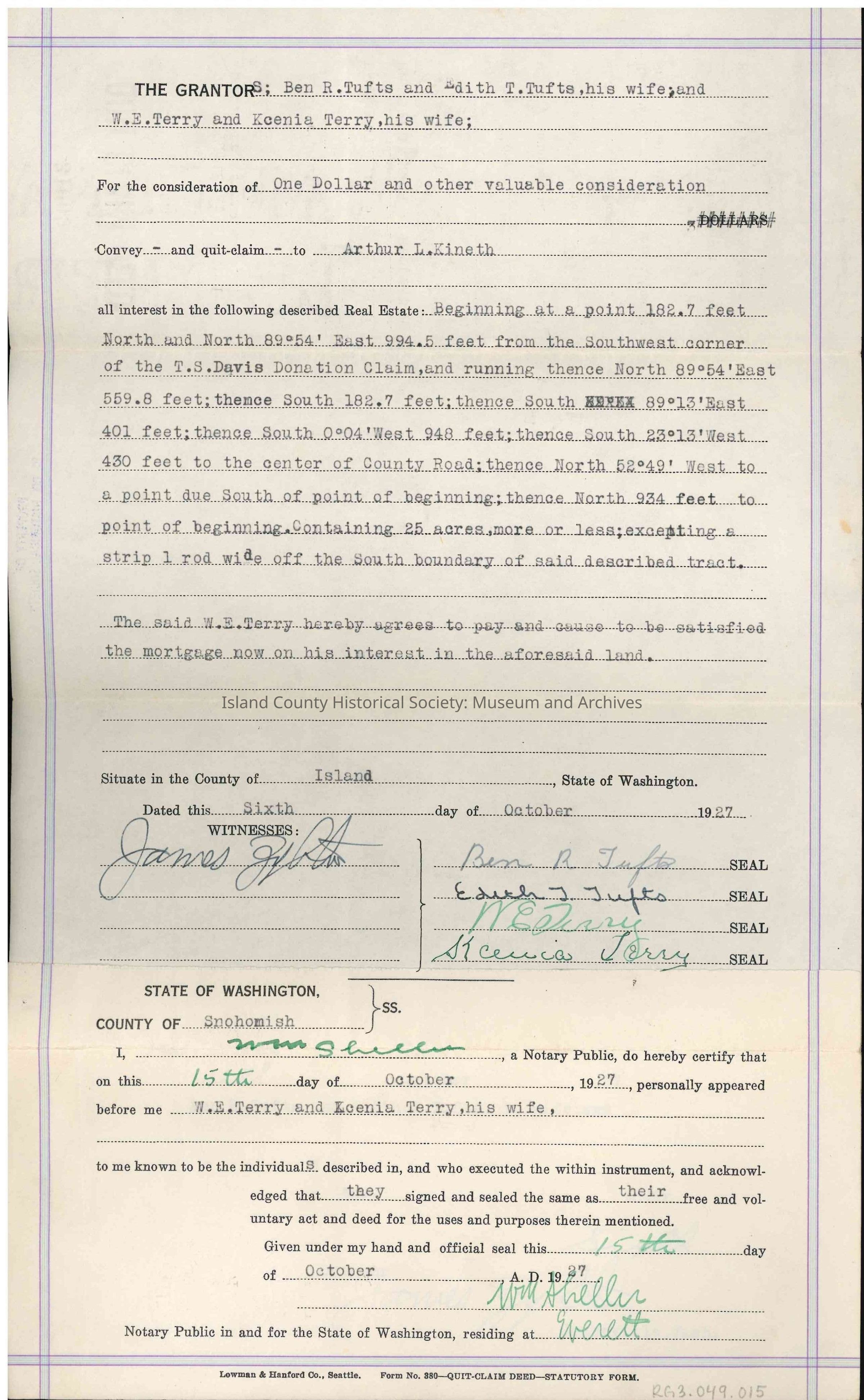 Quit-Claim deed for real estate in Island County, from Ben R. Tufts and Edith T. Tufts; and W.E. Terry and Koenia Terry, to Arthur L. Kineth, for a sum of "one dollar and other valuable consideration." Dated 06 October 1927. Published 01 November 1927.