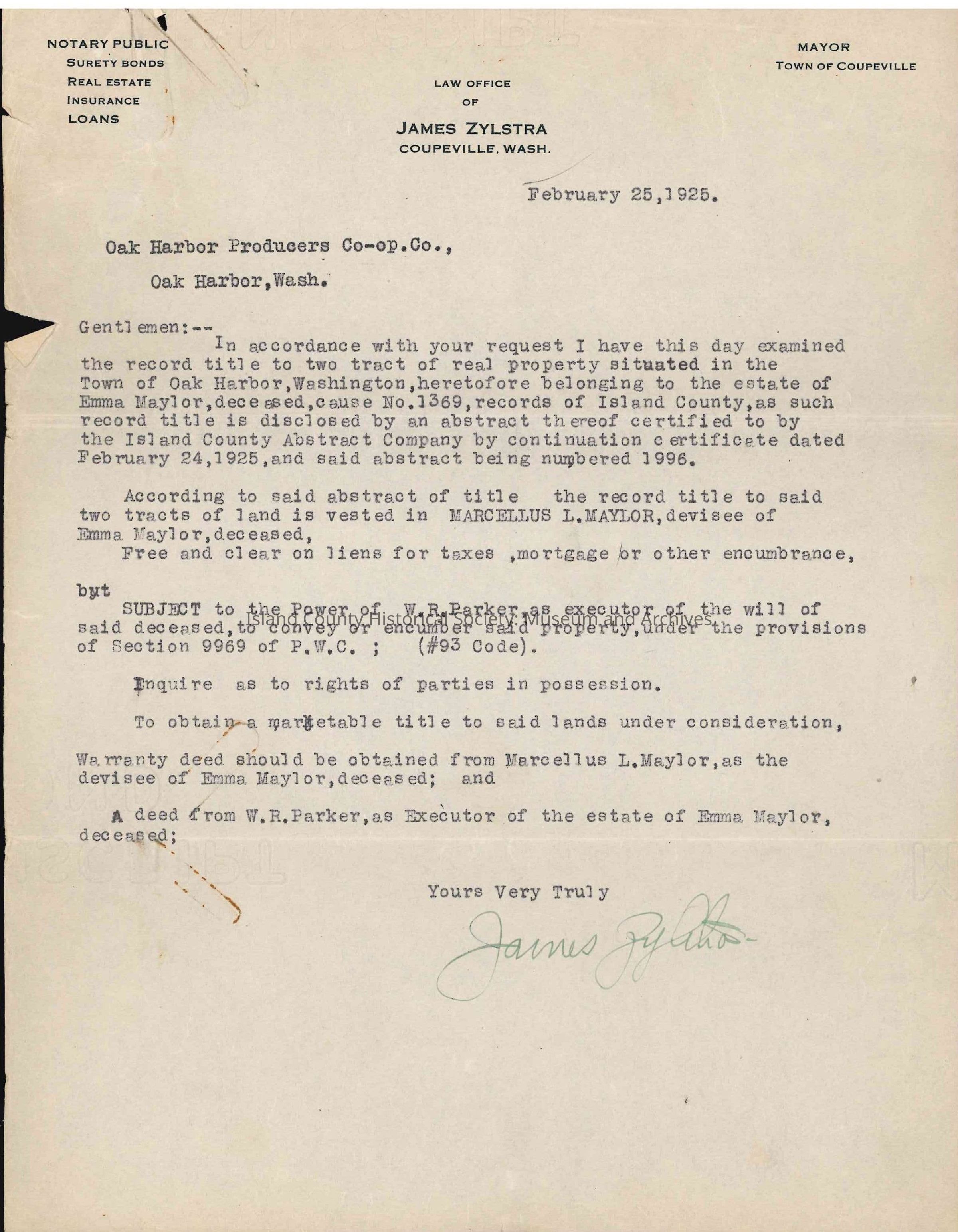 A typed letter from James Zylstra to the Oak Harbor Producers Co-op Co., responding to a request to examine the record title of two tracts of real estate which belonged to Emma Maylor. Dated 25 February, 1925.