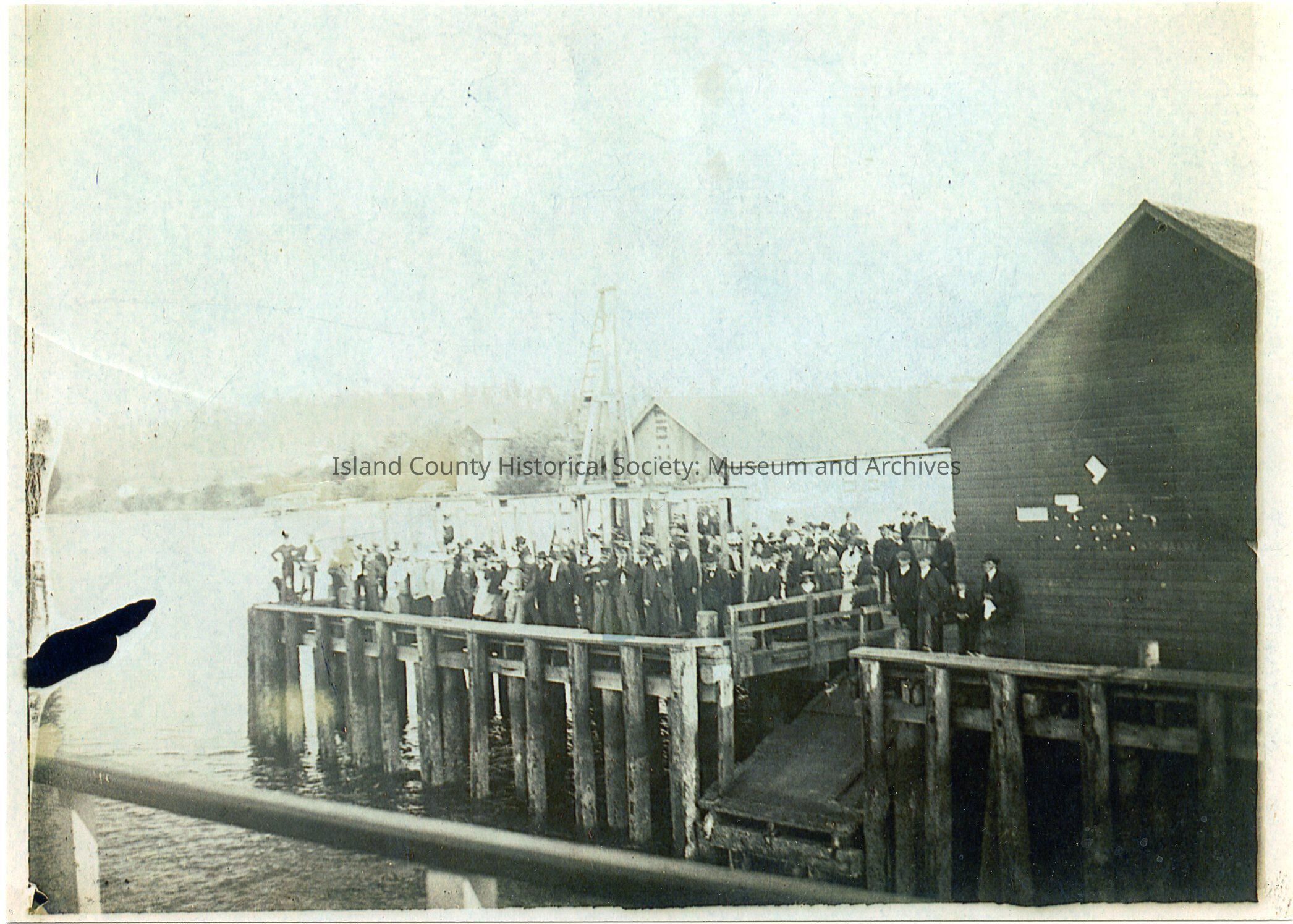 Photo of the wharf in Coupeville with a large number of people all dressed up and looking towards the water. The accession book states they are waiting for the ferry. It looks like the photo is taken from the ferry - there is a railing in the foreground. This might be the Robertson wharf/dock.